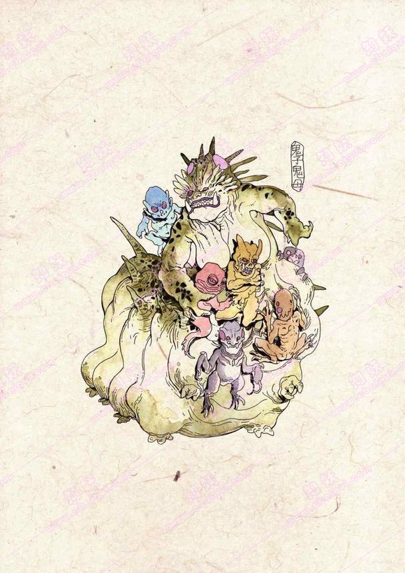 鬼母,住在南海的小虞山,又叫鬼姑神,虎龙足,蟒眉蛟目,形状奇伟古怪。她的本领更是大极了,能够生产天、地和鬼。一次就能生产十个鬼,早晨生下来,到晚上她就把她的儿子们当点心吃下肚子去。这身份也有点像造物主的身份,可惜是鬼,吃儿子的行为实在不体面,所以只好是“鬼母”罢了。