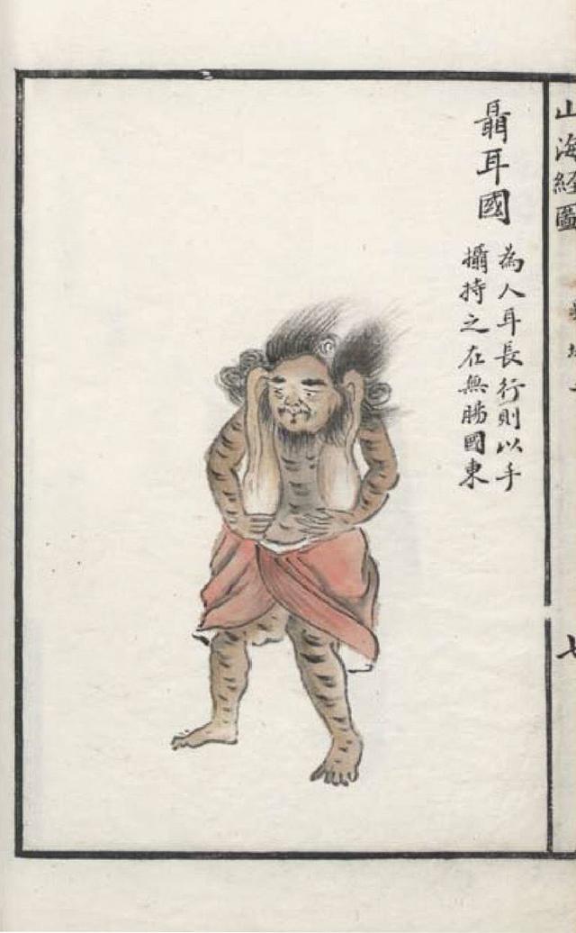聂耳之国在无肠国东,使两文虎,为人两手聂其耳。县(悬)居海水中,及水所出入奇物。两虎在其东。