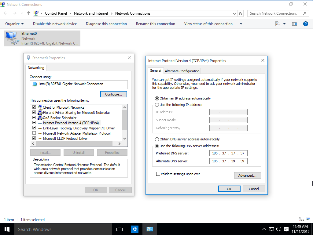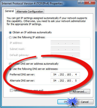 10. 在常规选项卡中单击使用以下 DNS 服务器地址并在提供的空格中输入 DNS 服务器:165.227.243.239和165.227.254.128