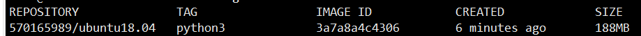 sudo docker commit -m=”ubuntu-vim” -a=”570165989″ 3b2df93c7860 570165989/ubuntu18.04:python3