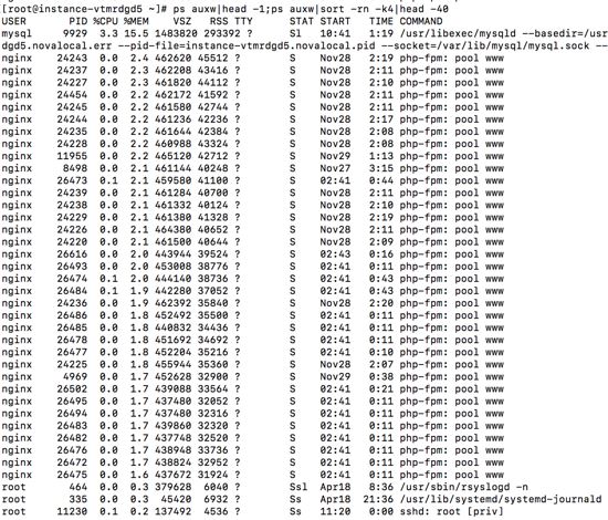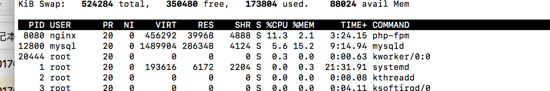 查看第四列内存使用占比,发现除了mysql数据库服务之外,php-fpm服务池开启了太多子进程,占用超过大半内存,问题找到了,我们开始解决问题:设置控制php-fpm进程池进程数量。