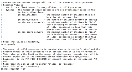 如图, pm.max_children 值为50,每一个进程占用1%-2.5%的内存,加起来就耗费大半内存了,所以我们需要将其值调小,博主这里将其设置为25,同时,检查以下两个属性: