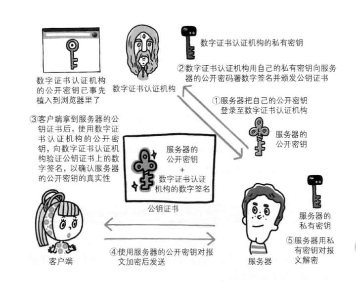当使用 HTTPS 建立加密连接的时候,浏览器会要求服务器提供 SSL/TLS 证书,然后浏览器使用自带的数字证书认证机构(简称 CA)的公钥,对服务器提供证书中的 CA 的数字签名进行验证。《图解 HTTP》中有一个非常形象的插图描述了整个流程。