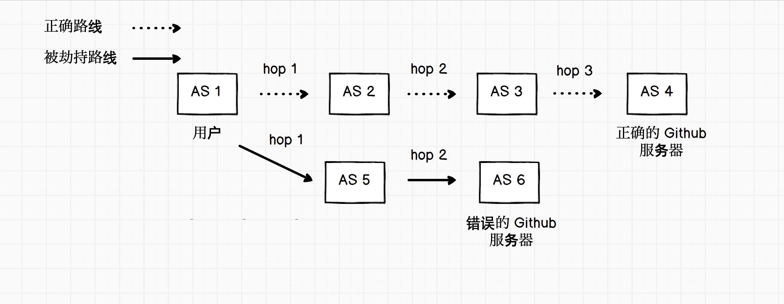 BGP 劫持就是某些 AS 通过宣称自己拥有某个 IP 地址,而将对该 IP 地址的请求引向一些恶意服务器。下图中 AS 指的是一个区域中大量计算机组成的网络,中国各家运营商管理着相应的 AS。用户知道github.com的 IP 地址后,从 AS 1 出发,正常来说,应该访问在 AS 4 的 Github 服务器,但是 AS 5 与 AS 6 欺骗 BGP 它拥有 github.com 的 IP 地址并且误导 BGP 的路径经过它,于是用户变成访问 AS 6 服务器,但是用户还以为自己连接的是正确的服务器(根据 IP 地址)。万幸的是,由于 AS 6 的服务器无法提供正确的 Github 证书,所以 HTTPS 连接无法正确建立,而这也是整个事件的真正原因。Cloudflare 有一篇非常好的文章What Is BGP Hijacking?解释了什么是 BGP 以及 什么是 BGP 劫持。