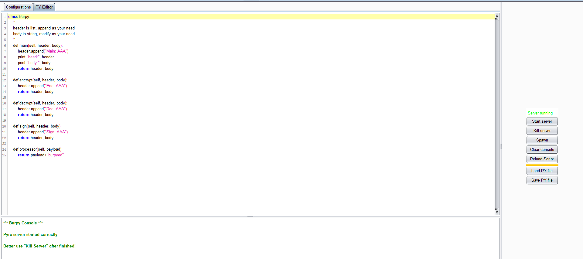 刚开始的时候Burpy只能执行一个自己的Python函数,把在Burp中选择的内容传进去,经过函数处理之后返回给Burp。