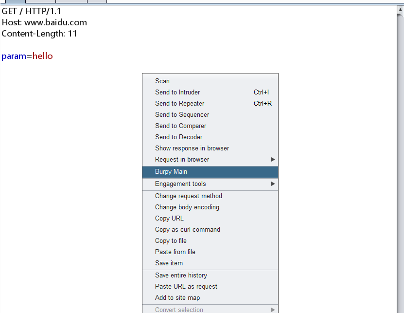 在没有Enable其他开关的时候,右键菜单里面就一个`BurpyMain`项,它调用的就是我们脚本里面的`main`函数。