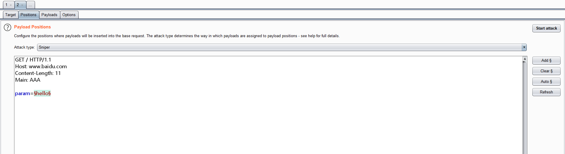 我们把一个数据包发送到Intruder,然后设置一下