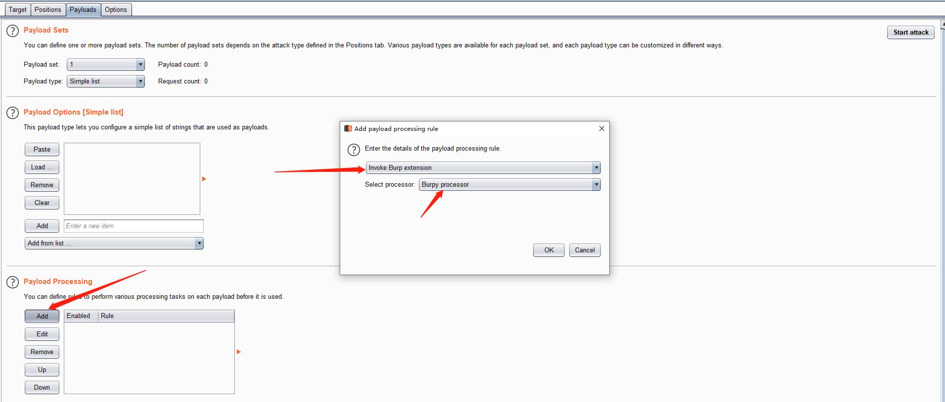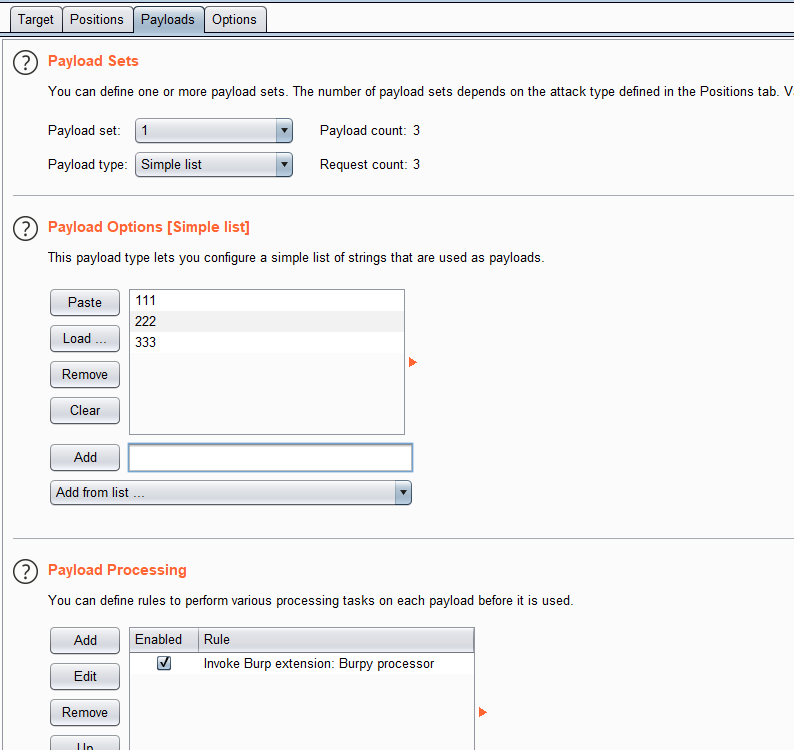 在Payloads界面增加一个处理方式,选择`InvokeBurpextension`,然后选择我们的`Burpyprocessor`