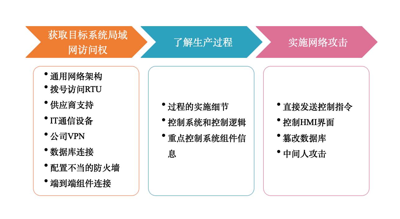 要想实施对控制系统局域网的攻击,首先需要接入工业控制系统局域网,其次还要了解其控制的生产过程,最后通过控制系统特有的攻击方法进行攻击。