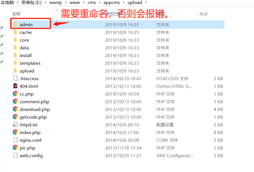 注明:在安装完毕我们进入后台后会提示将安装目录下admin目录进行重命名,否则会报错的。我将这个目录重命名为cmdback目录。