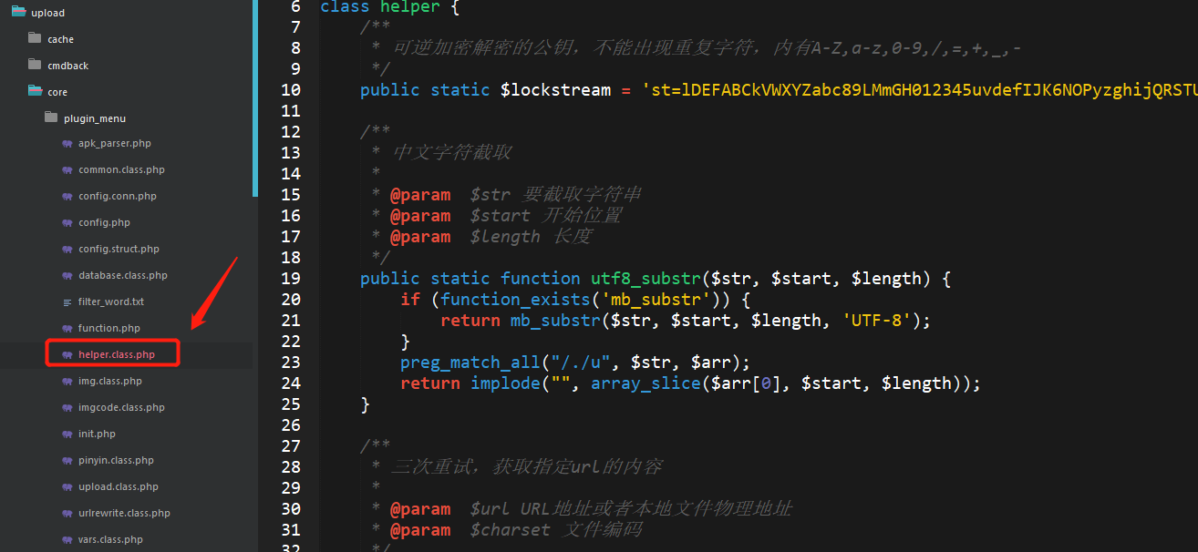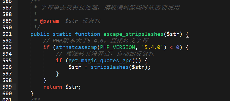 在代码的第90行定义了一个全局变量$page, $dir = dirname(__FILE__) . ‘/../templates/’ . TEMPLATE,这段代码是来定义目录的,dirname()函数是返回路径中的文件名部分;那么helper :: escape_stripslashes是个什么东东?通过查找在core目录下的一个类文件helper.class.php,文件中定义了一个helper的类。在文件中搜索escape_stripslashes。我们来看一下591–599的代码主要是说的什么,if条件判断语句