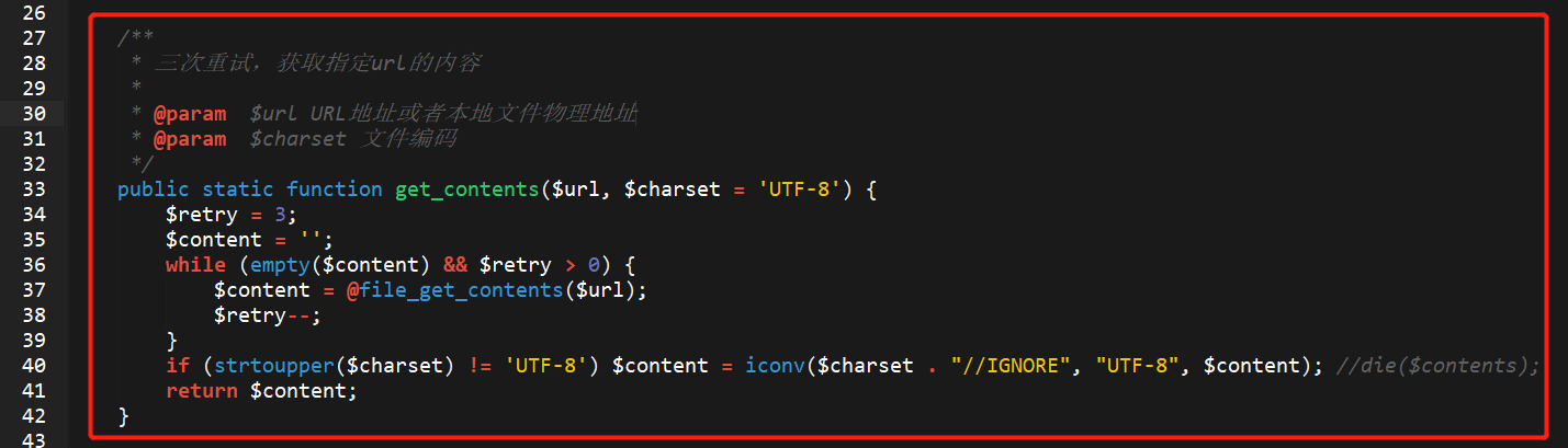 我们看一下第79行后面的代码,这段代码主要是未对用户输入的做过滤条件以及未对文件目录的访问权限做限制,这样用户就可以直接读取网站内部的敏感信息。if语句中的is__file()判断文件是否存在,80行$filecont = helper::get_contents($dir . “/” . $page[‘get’] [‘filename’]);这是调用一个类,那好我们去追一下这个类,类的文件还是 helper.class.php。定义一个通过静态函数get_contents,$retry = 3 //定义一个数字型的变量;$content=” //定义一个字符型的变量,while语句来循环判断$content是否为空,并且$restry是否大于0,都满足条件的话就会将整个文件读取到一个一个字符串中,$retry– 是自减一;