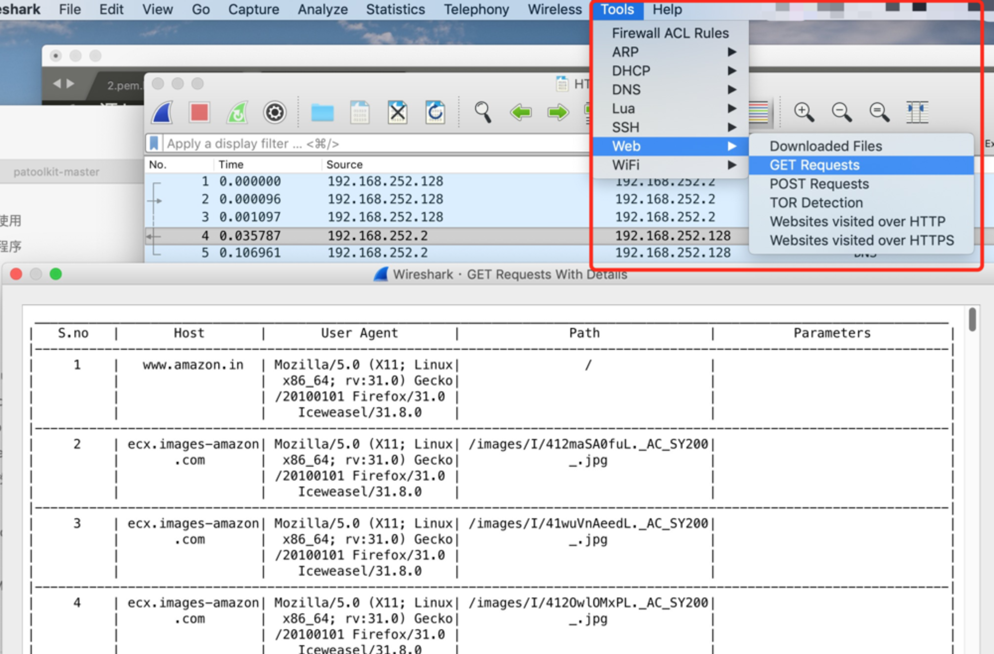 PA Toolkit的插件有以下几种,大概说下功能: WiFi(WiFi网络概览,检测beacon,deauth floods洪水攻击等) HTTP(列出所有访问过的http网站,通过http协议下载的文件) HTTPS(列出以HTTPS协议访问的所有网站的域名) ARP(MAC-IP表,检测MAC地址欺骗和ARP投毒) DNS(列出使用的DNS服务器和DNS解析,检测DNS Tunnels)