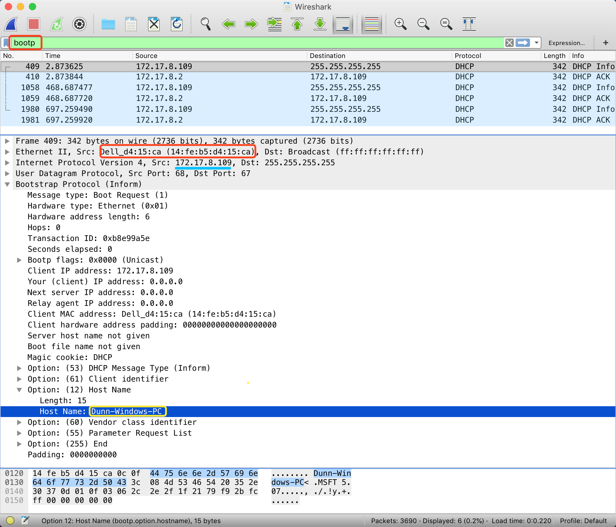 可以通过查看DHCP流量(过滤语法:bootp)将IP地址、MAC地址和计算机名,三者关联起来,如下图所示。