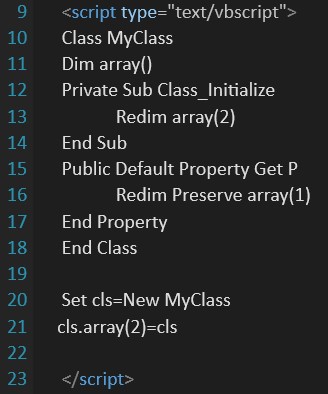 Crash PoC定义了MyClass类、一个array的成员变量和两个成员函数:Class_Initialize与Default Property Get P。Class_Initialize是一种被弃用的方法,现在已经被新的过程所替代。当对象初始化的时候,会被自动唤醒。在PoC中,Class_Initialize是重载的,当调用VBScriptClass::InitializeClass时,处理的是重载的函数。