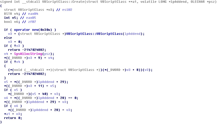 MyClass:通过new进行创建并赋值给指定变量cls,该操作首先会触发类的创建以及初始化,创建类的函数由vbscript!VBScriptClass::Create函数完成;