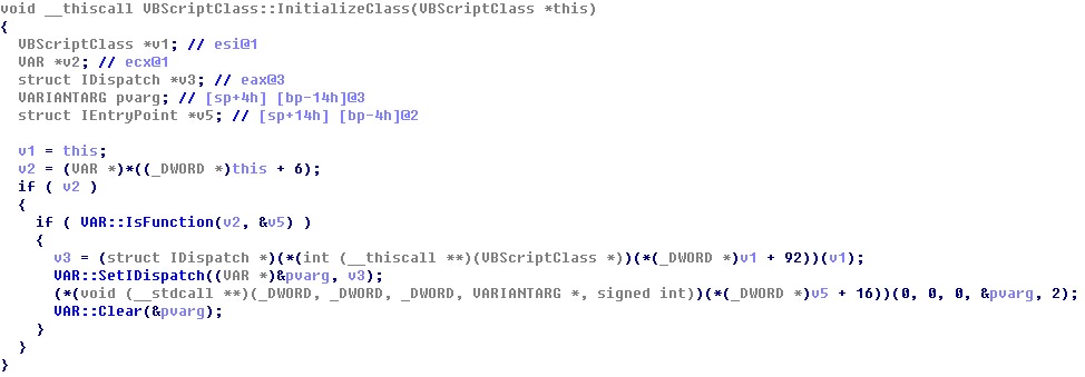 创建类成功后则会调用vbscript!VBScriptClass::InitializeClass函数对class的内容进行初始化;