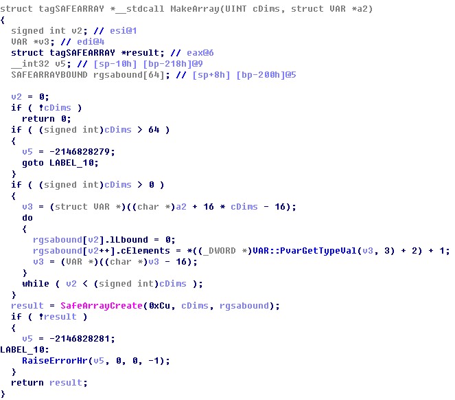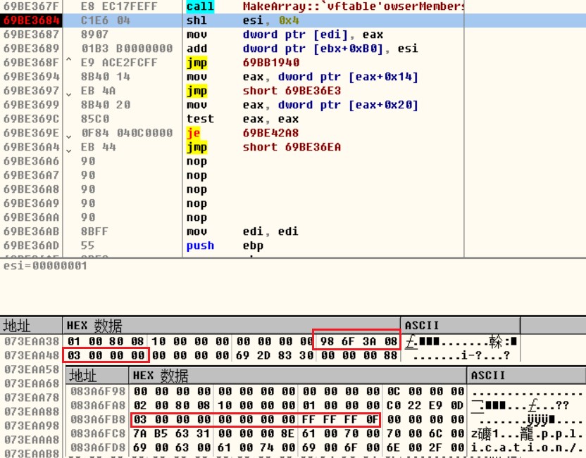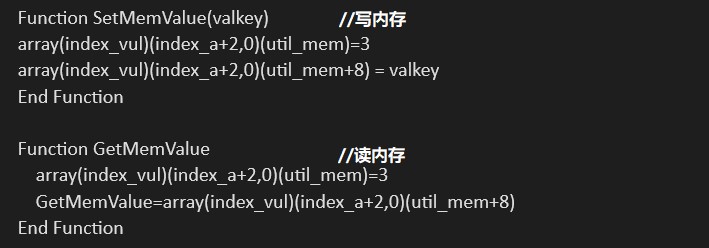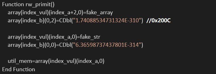 将array(index_vul)(index_a, 0)设置为“AAAA”,使下个array2的Data域就变成了8,因为string的VarType类型为8,这样就得到了一组可以混淆的array(index_vul)(index_a+n,0)和array(index_b)(0, n),通过将array(index_vul)(index_a,0)处的variant转化为长整型,令array(index_vul)(index_a,0)处的variant转化为数组,从而得到了一段泄露的内存util_mem,即可读写内存指定区域。