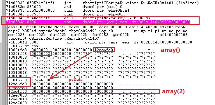 cls.array(2):调用vbscript!Accessarray来获取数组元素的地址。在vbscript!Accessarray中,首先会检查数组元素的索引是否越界,然后计算元素的地址,保存到栈中。