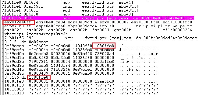 漏洞定义了两个数组,array1和array2。array1就是前面PoC中描述的数组,array2是一个二维数组,其中每个元素的值都是3。然后使用脚本回调函数DefaultPropertyGet释放原来的array1.pvData,设置array2为新的array1.pvData。因为原来array1.pvData的大小和array2.SAFEARRAY结构是相同的,在内存中是0x30字节。array2.SAFEARRAY结构将重用原始array1.pvData中释放的内存。同时,DefaultPropertyGet的返回值0x0FFFFFFFF会覆盖array2.SAFEARRAY的结构SAFEARRAYBOUND,并修改二维数组的长度为0x0FFFFFFF。