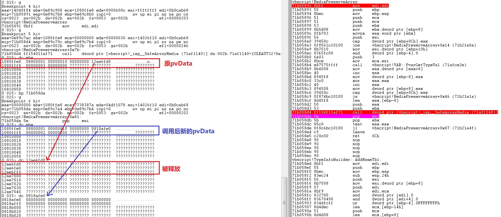 ReDimPreserve array(1):重置array内存的操作实际通过函数RedimPreserveArray实现,最终会调用SafeArrayRedim可以看到array对象的pvData已经被修改为0x0818afe0,之前的pvData(0x12ae6fd0)的内存地址已经被释放,包括之前保存在栈上的0x12ae6ff0。