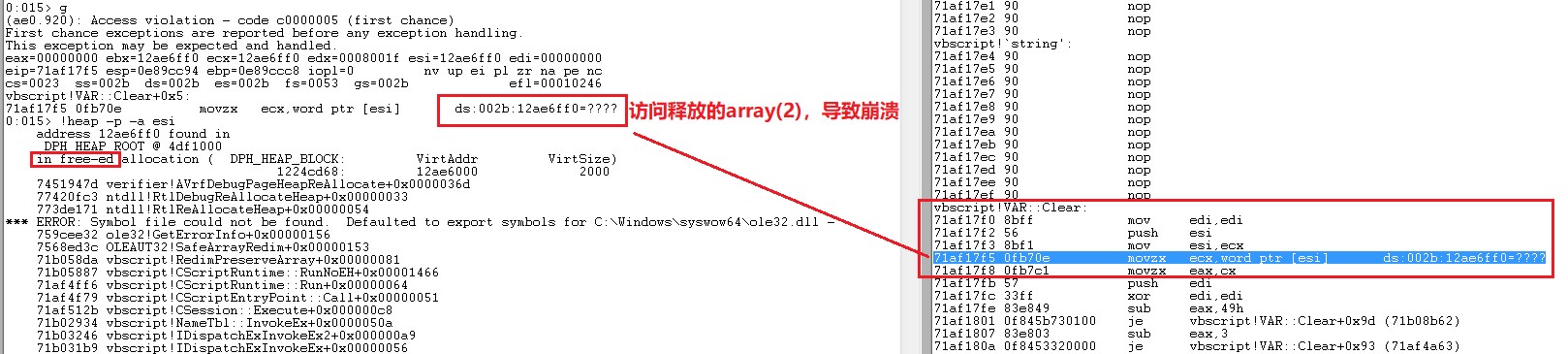 array(2)的地址仍然保存在栈中,Public Default Property Get P的返回值会访问释放的内存,最终导致UAF漏洞。